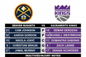 体育资讯11月04日讯 NBA常规赛,国王将于10:00客场挑战掘金。 赛前,NBA官方公布了两队首发: 国王首发:丹尼斯-施罗德、扎克-拉文、德玛尔-德罗赞、拉塞尔-威斯布鲁克(大前锋)、多曼塔斯-萨博尼斯 掘金首发:贾马尔-穆雷、克里斯蒂安-布劳恩、卡梅隆-约翰逊、阿隆-戈登、尼科拉-约基奇