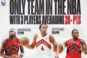 体育资讯11月6日讯 NBA Canada报道,猛龙队是联盟目前唯一一支有三位球员场均得分超过20分的球队。 其中英格拉姆场均21.1分、斯科蒂·巴恩斯20.9分、巴雷特20.8分。而目前联盟场均得分至少20分的一共有45人。