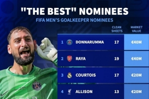 体育资讯11月7日讯 FIFA公布了年度最佳男足门将候选名单,德国转会市场列出了入围者身价排名,多纳鲁马、拉亚4000万欧居首。 最佳门将候选身价排名(括号内为24-25赛季零封次数): 多纳鲁马(17)——4000万欧 拉亚(19)——4000万欧 库尔图瓦(17)——2000万欧 阿利松(13)——2000万欧 马丁内斯(16)——1600万欧 索默(22)——400万欧 诺伊尔(21)——400万欧 什琴斯尼(14)——100万欧