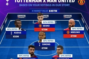 体育资讯11月8日讯 北京时间今天晚上20点30分,热刺将在英超第11轮比赛中主场对阵曼联。德国转会市场根据关注者的投票列出热刺+曼联阵容,B费、舍什科、西蒙斯、范德芬在列。 德转票选热刺+曼联阵容 门将:维卡里奥(热刺) 后卫:卢克-肖(曼联)、范德芬(热刺)、德里赫特(曼联)、波罗(热刺) 中场:B费(曼联)、卡塞米罗(曼联)、哈维-西蒙斯(热刺) 前锋:库杜斯(热刺)、舍什科(曼联)、姆伯莫(曼联) 主帅:阿莫林(曼联)