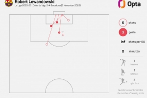 体育资讯11月10日讯 西甲第12轮比赛,莱万上演帽子戏法,巴萨客场4-2击败塞尔塔。 据Opta统计,37岁80天的莱万是本世纪西甲第三年长的戴帽球员,仅次于若热-莫利纳(39岁241天)、华金-桑切斯(38岁140天)。