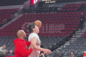 今天迎战联盟第一的雷霆!杨瀚森赛前和助教练习篮下卡位,以及抢板终结得分!