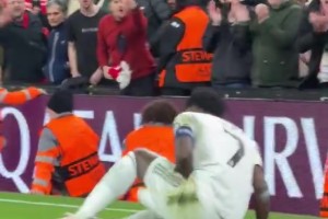 维尼修斯在和布拉德利对抗中倒地,惨遭利物浦球迷怒骂😡